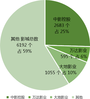 截止2018年底,中國排名前三的院線公司影院數、銀幕數、票房占市場份額百分比情況